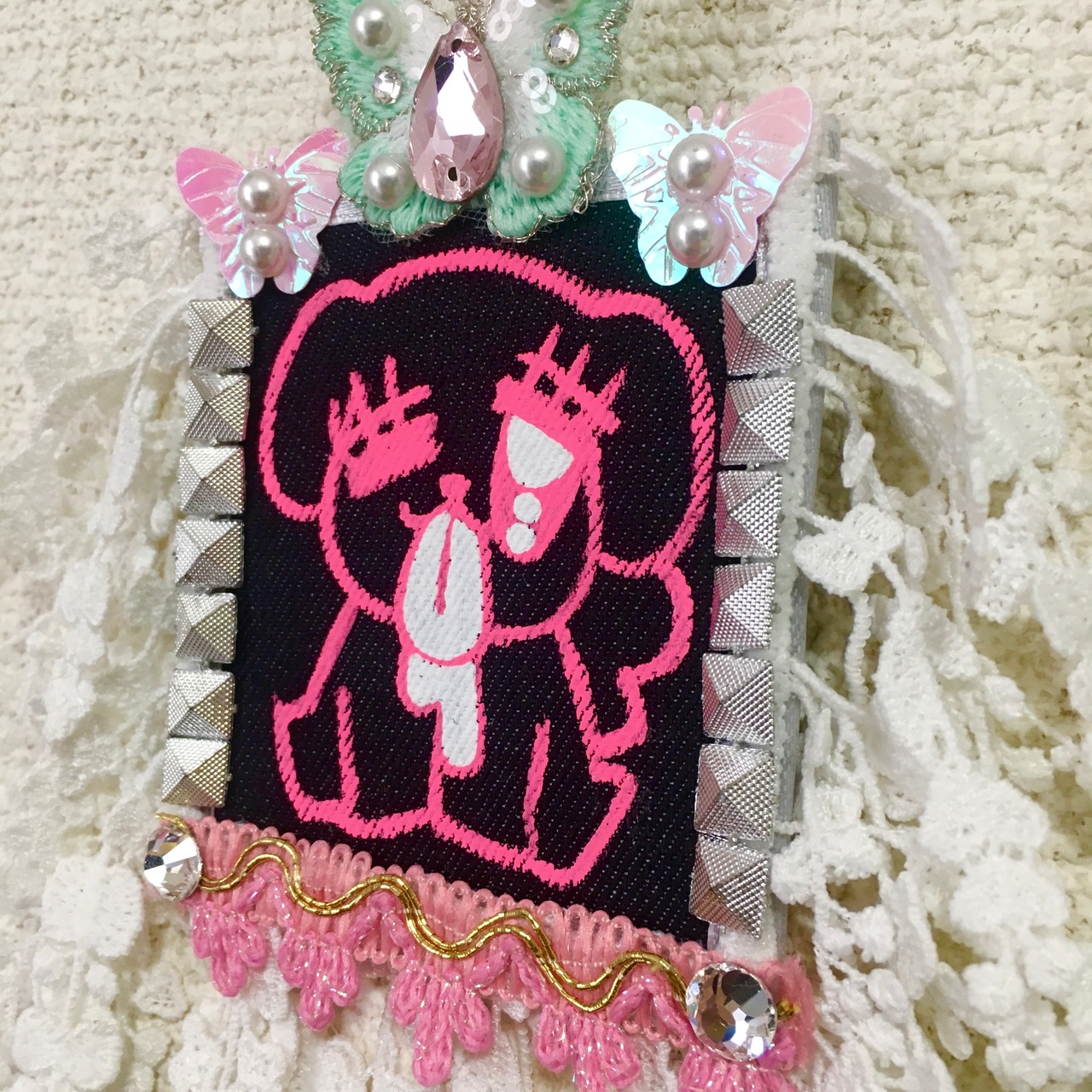 仕様:布/アクリル絵具/アクリルレース/プラスチックパーツ/ガラスetc